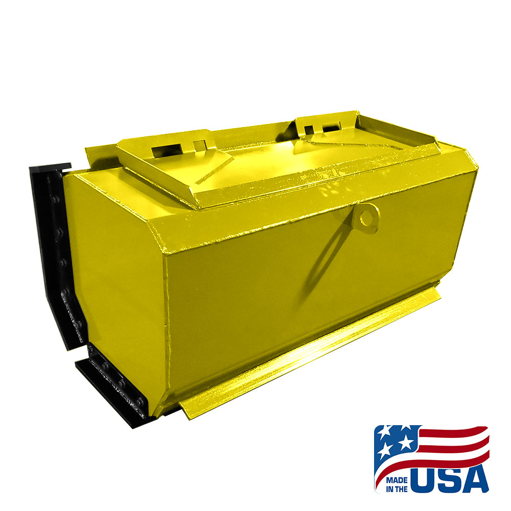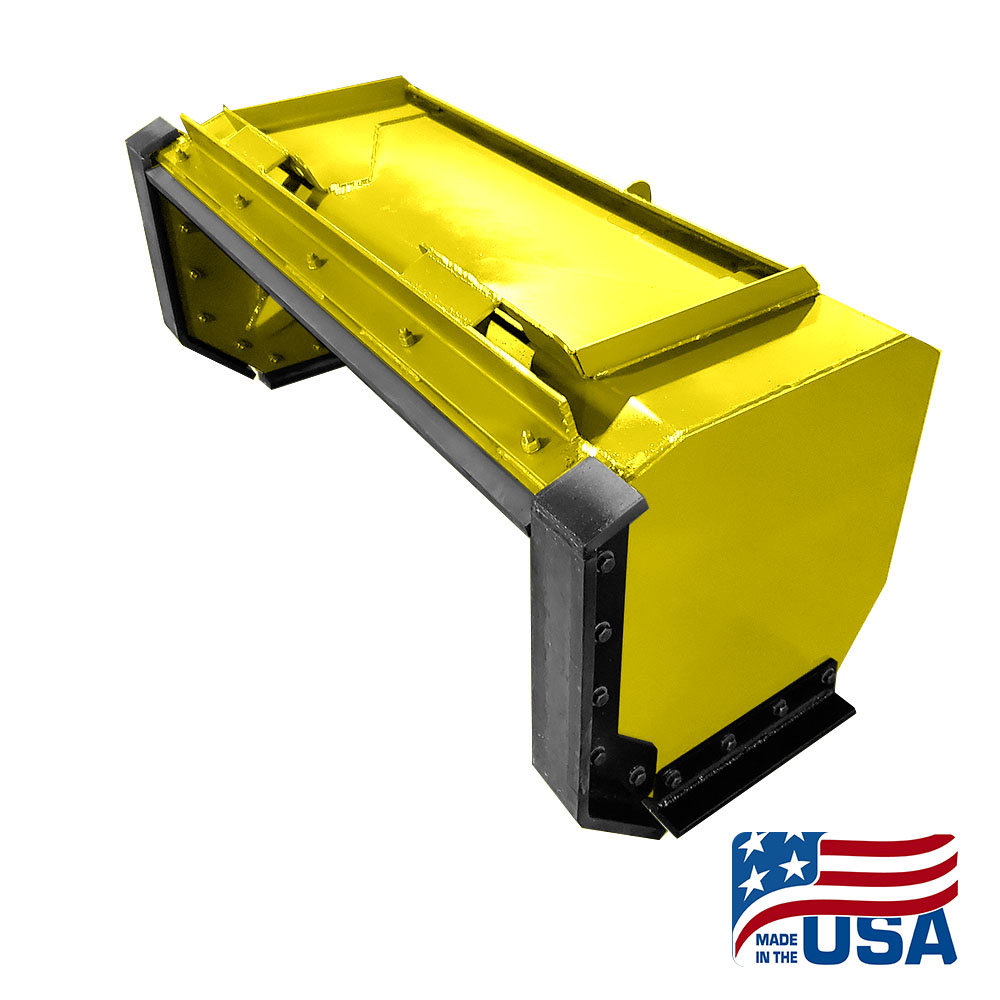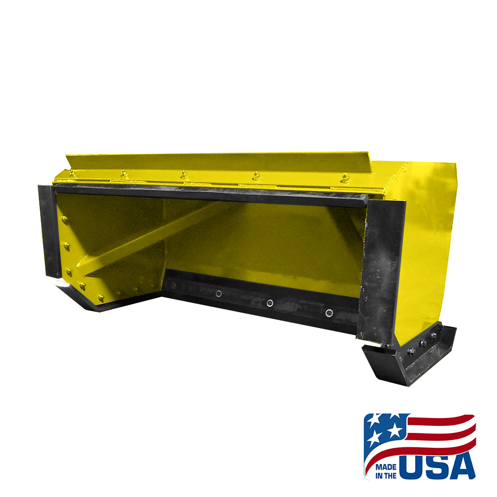 Yellow Heavy Duty Skid Steer Snow Pusher Back Drag. Back drag is fully enclosed so the snow will not fall through, and has a set of skids for the back drag so you will not ruin your sides.